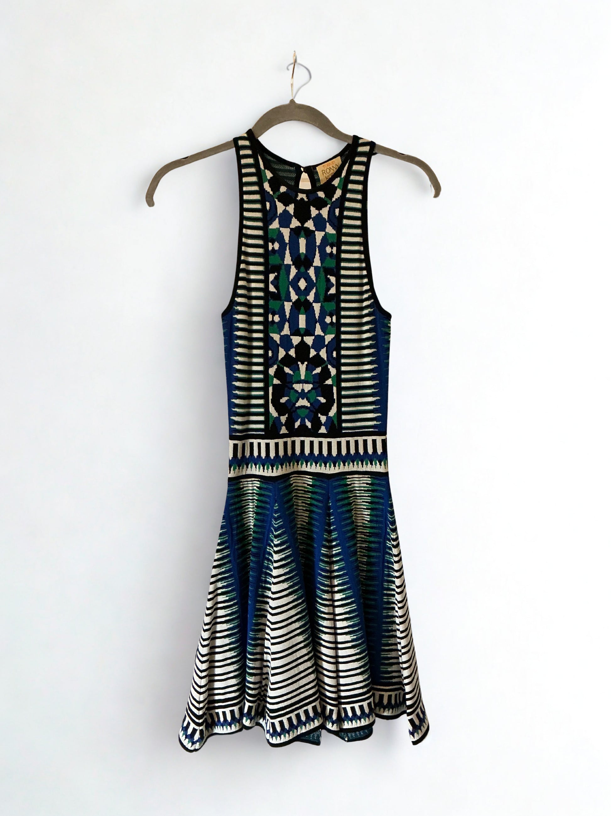 Make a statement in this Torn by Ronny Kobo knit mini dress, featuring a bold geometric pattern in shades of blue, black, and white. Designed with a fitted bodice and flared skirt, this iconic silhouette flatters every curve. A premium designer piece perfect for nights out or stylish events.