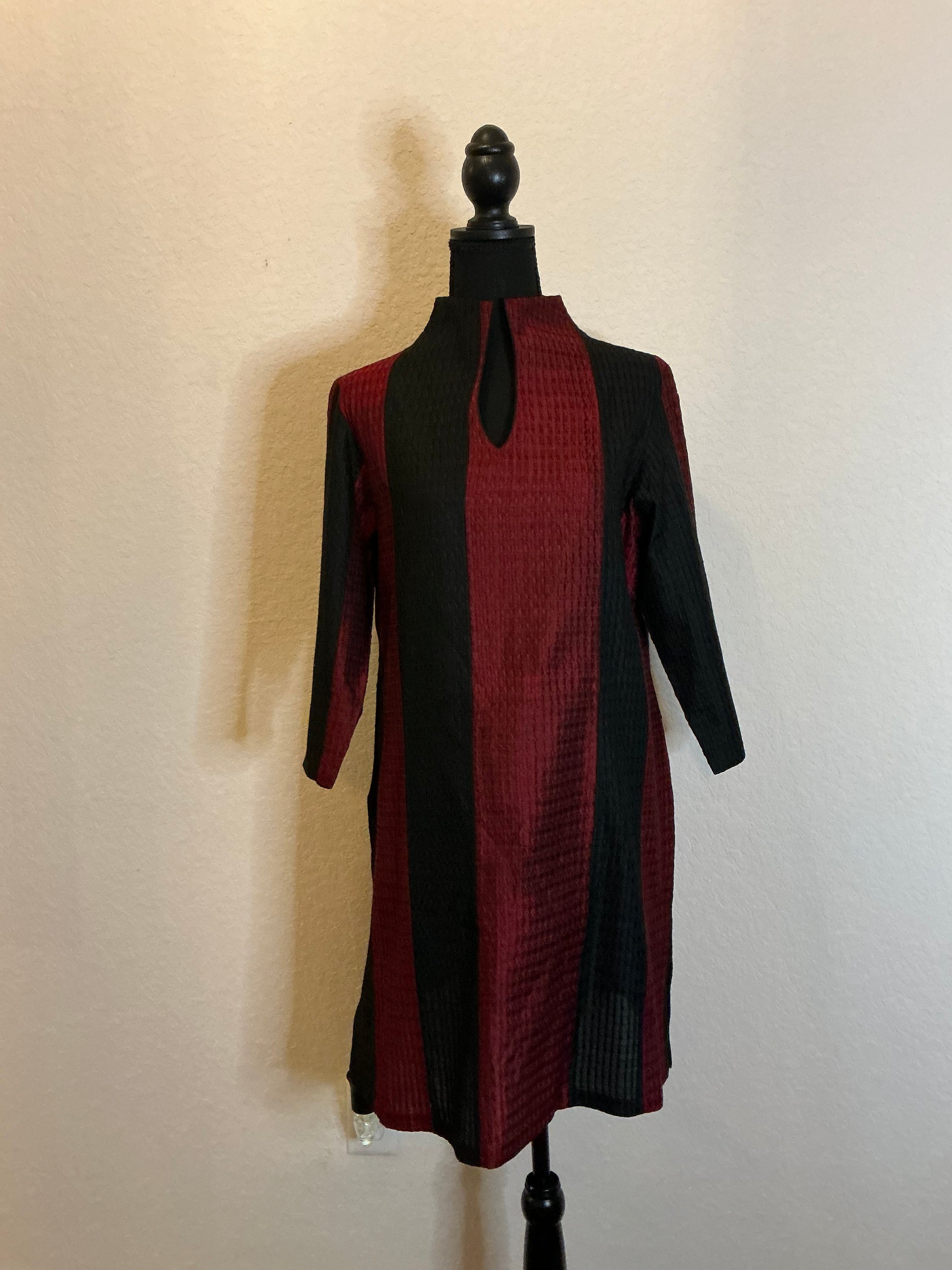 This rare Vivek Narang designer dress features a luxurious textured silk-blend fabric in bold black and deep burgundy vertical panels. With a refined Mandarin collar and subtle keyhole neckline, the tailored A-line silhouette exudes effortless sophistication.