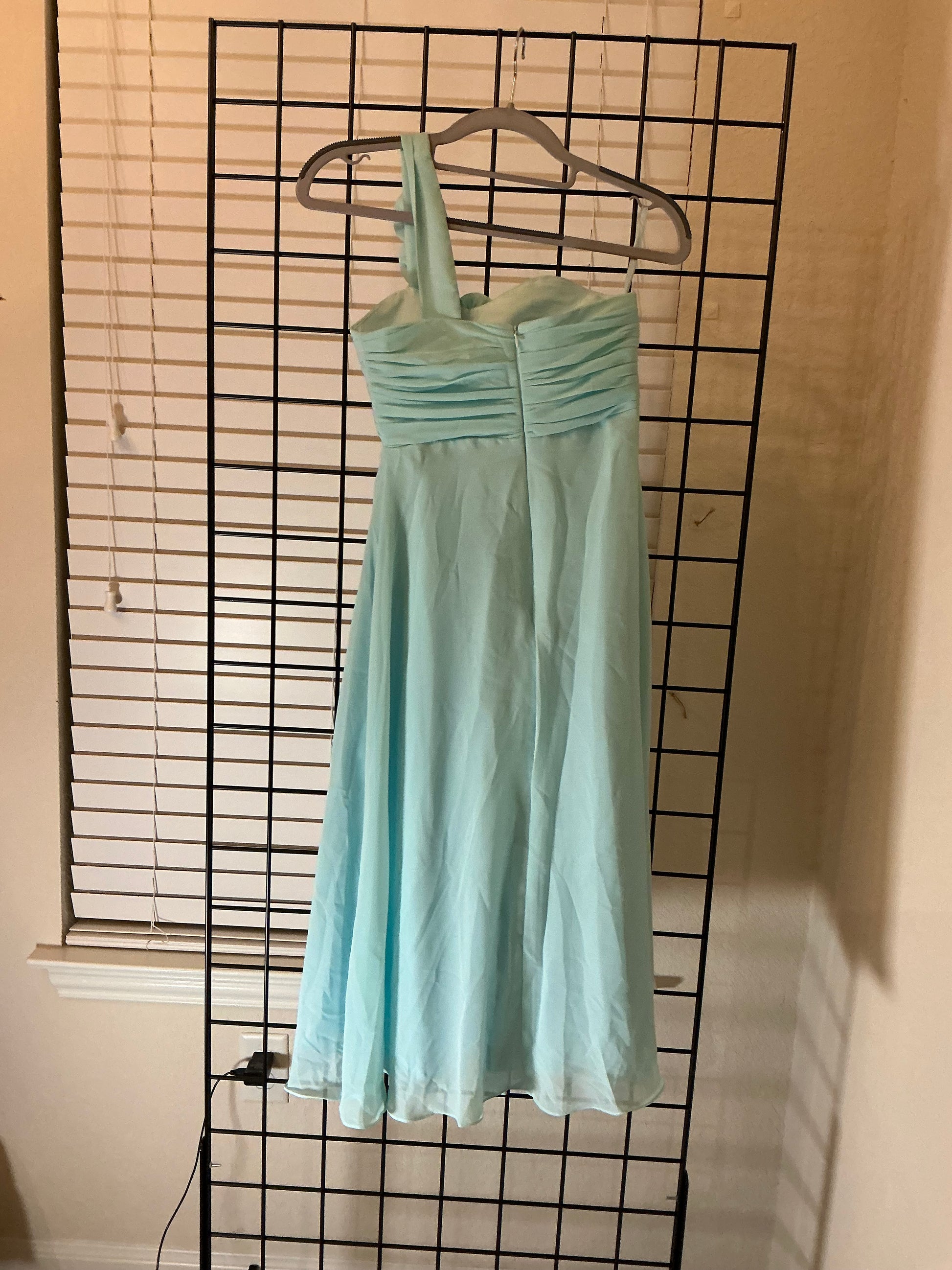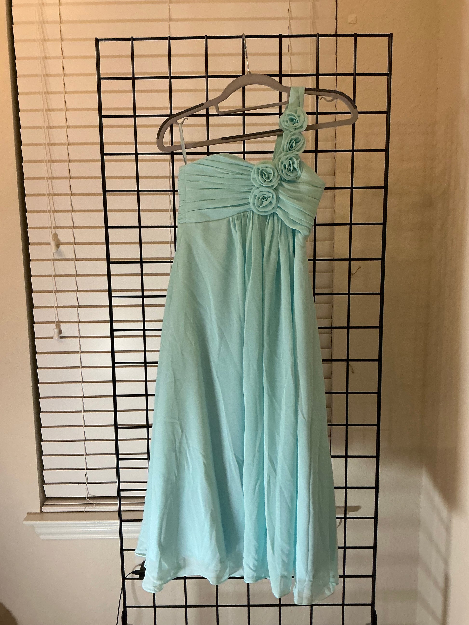 Aqua Blue One Shoulder Chiffon Dress with Rosette Strap – Size 2 – Flowy Formal Bridesmaid or Party Dress